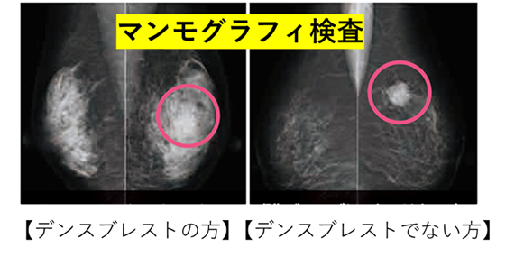 デンスブレストの場合、マンモグラフィではしこりが乳腺に隠れて見えにくくなることがあります。